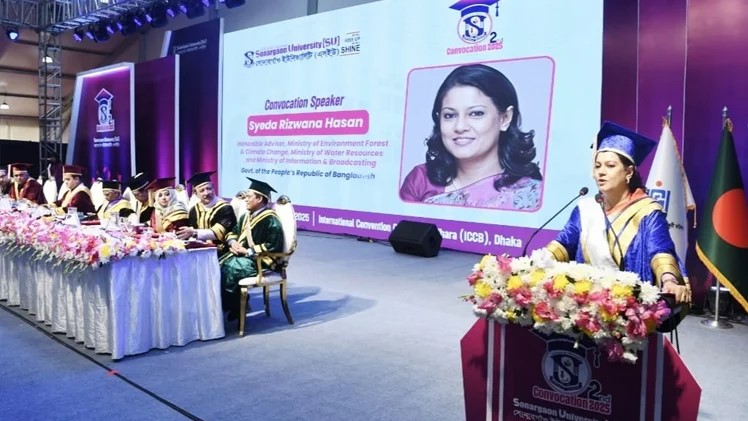 আজ রোববার রাজধানীর আন্তর্জাতিক কনভেনশন সিটি বসুন্ধরায় অনুষ্ঠিত সোনারগাঁও ইউনিভার্সিটির দ্বিতীয় সমাবর্তন-২০২৫ অনুষ্ঠানে সমাবর্তন বক্তৃতায় তিনি এ কথা বলেন।