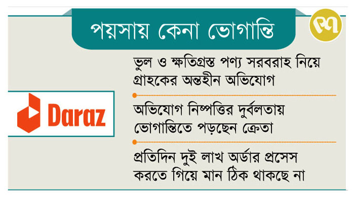 রামিসা রহমান ও সাদিকুল ইসলাম : দেশে ই-কমার্স ব্যবসার দ্রুত প্রসার ঘটছে। কয়েক বছরের মধ্যে দারাজ বড় একটি ই-কমার্স প্রতিষ্ঠানে পরিণত হয়েছে। প্রতিষ্ঠানটির দাবি, তারা প্রতিদিন দুই লাখ অর্ডার প্রসেস করছে। কিন্তু সেই তুলনায় অভিযোগ নিষ্পত্তিসহ প্রতিষ্ঠানটির কমপ্লায়েন্স ম্যানেজমেন্ট শক্তিশালী না হওয়ায় গ্রাহকরা ভোগান্তিতে পড়ছেন। অনেক সময় অনেক অভিযোগ নিষ্পত্তি হচ্ছে না। এ কারণে এখন অনেকেই গোটা অনলাইন কেনাকাটার ওপর আস্থা হারিয়ে ফেলছেন।