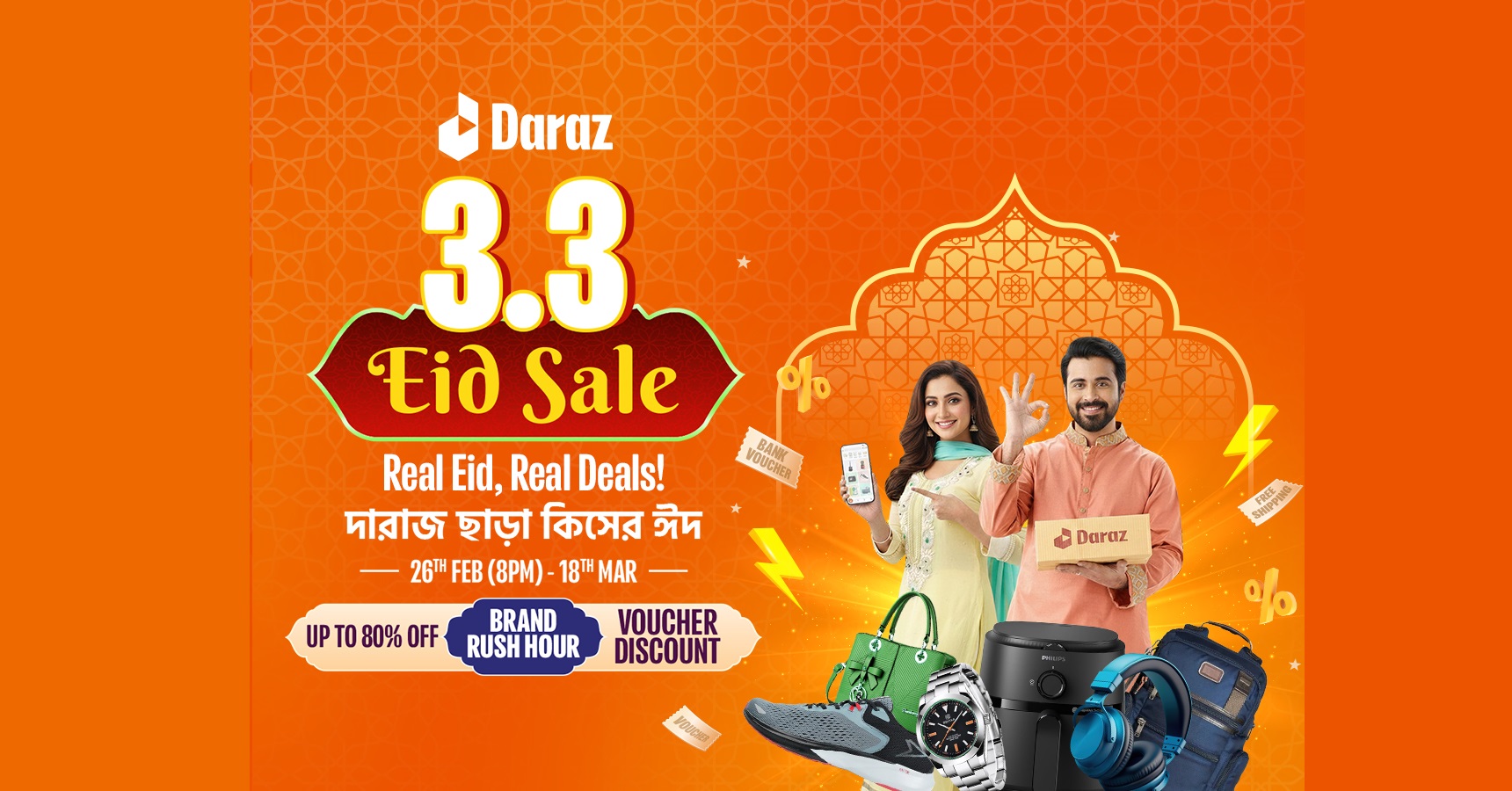 নিজস্ব প্রতিবেদক: দেশের শীর্ষস্থানীয় অনলাইন মার্কেটপ্লেস দারাজ বাংলাদেশ ‘রিয়েল ঈদ, রিয়েল ডিলস’ প্রতিপাদ্যে আনুষ্ঠানিকভাবে শুরু করেছে বছরের অন্যতম প্রতীক্ষিত ক্যাম্পেইন ‘৩.৩ ঈদ সেল’। ঈদকে সামনে রেখে গত ২৬ ফেব্রুয়ারি রাত ৮টা থেকে শুরু হওয়া এ শপিং উৎসব চলবে ১৮ মার্চ ২০২৬ পর্যন্ত।