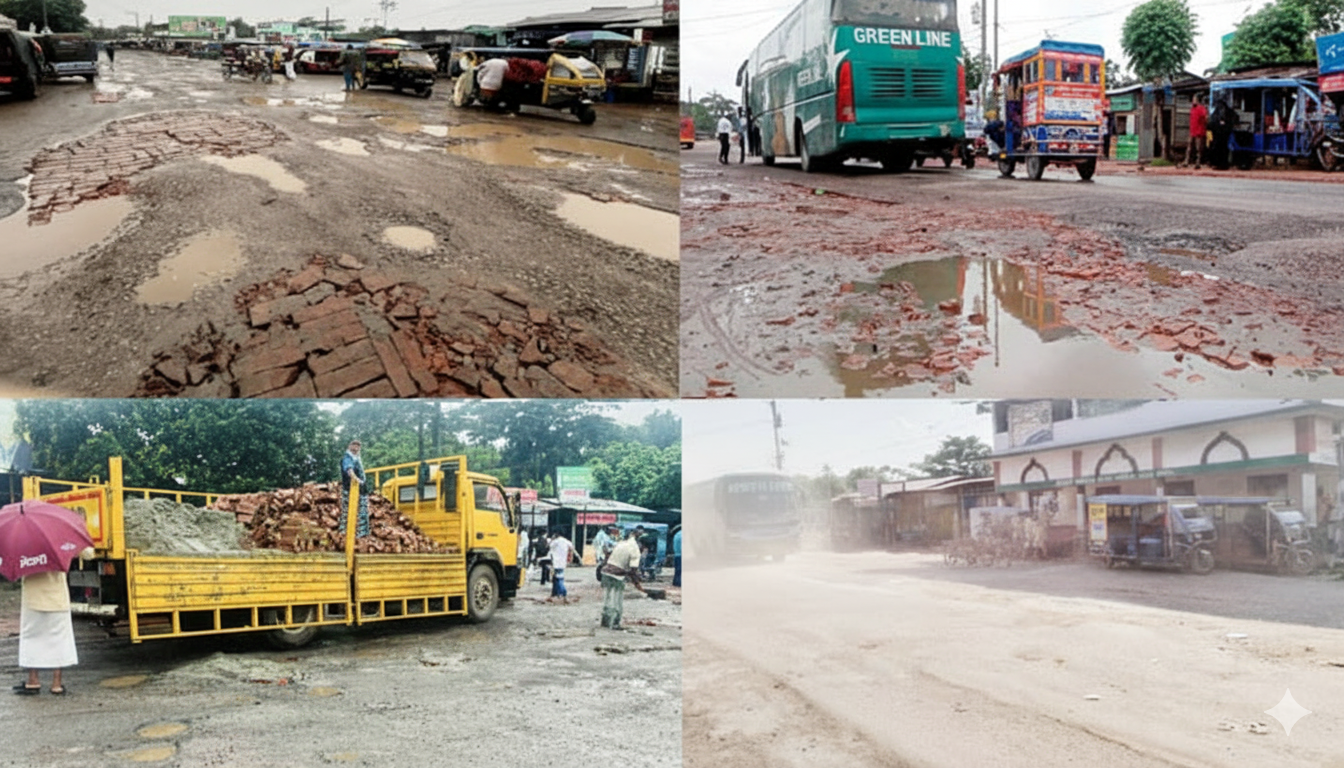 মহাসড়কের গৌরনদী উপজেলার বাটাজোর থেকে টরকী বন্দর পর্যন্ত সরেজমিনে দেখা গেছে, ইট-বালু দিয়ে মহাসড়ক সংস্কারের চিত্র।