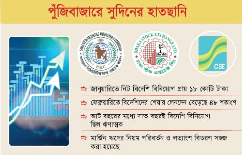 তবে সেন্ট্রাল ডিপোজিটরি বাংলাদেশ লিমিটেডের তথ্য বলছে, বিনিয়োগের পরিমাণ বাড়লেও বিদেশি বিনিয়োগকারীর সংখ্যা কিছুটা কমেছে। জানুয়ারির শুরুতে বিদেশিদের বেনিফিশিয়ারি ওনার্স (বিও) হিসাব ছিল ৪৩ হাজার ৫৪৯টি, যা ফেব্রুয়ারির ১৫ দিন শেষে কমে দাঁড়িয়েছে ৪৩ হাজার ১০১টিতে। অর্থাৎ এ সময়ে ৪৪৮টি বিও হিসাব কমেছে। অর্থাৎ অংশগ্রহণকারী বিনিয়োগকারীর সংখ্যা কিছুটা কমলেও যারা বাজারে সক্রিয় রয়েছেন, তারা আগের তুলনায় বেশি বিনিয়োগ করছেন।