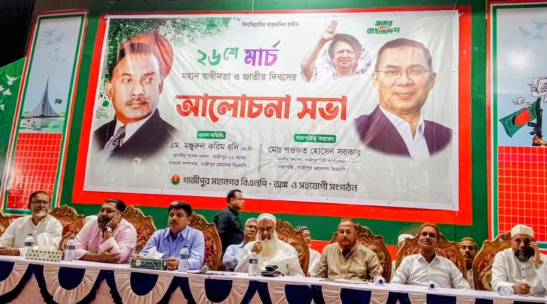 আজ রোববার দুপুরে নগরীর বঙ্গতাজ অডিটরিয়ামে অনুষ্ঠিত এ আলোচনা সভায় মহানগর বিএনপি ও এর অঙ্গ-সহযোগী সংগঠনের বিপুল সংখ্যক নেতাকর্মীর উপস্থিতি লক্ষ্য করা যায়। এতে সভাপতিত্ব করেন মহানগর বিএনপির সভাপতি ও গাজীপুর সিটি করপোরেশনের প্রশাসক মো. শওকত হোসেন সরকার। প্রধান অতিথি হিসেবে উপস্থিত ছিলেন গাজীপুর-২ আসনের সংসদ সদস্য এম. মঞ্জুরুল করিম রনি।