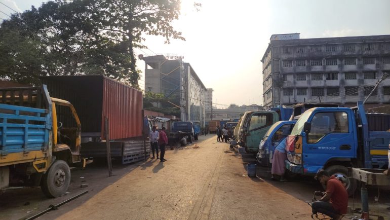 তবে সরেজমিনে ঘুরে দেখা গেছে, রাস্তার দুপাশে সারি সারি ট্রাক। এর মধ্যে কোনো কোনো ট্রাক বের হচ্ছে, আবার কোনো ট্রাক সেখানেই অবস্থান করছে। আবার কোনো ট্রাকের মেরামতের কাজও চলছে। যেখানে টুংটাং শব্দ হচ্ছে, করা হচ্ছে ওয়েল্ডিং। ট্রাকগুলো দুপাশে অবস্থানের কারণে চলাচলও সীমিত হয়ে গেছে। শিক্ষার্থীদের চলাচল অনেক ঝুঁকি হয়ে দাঁড়িয়েছে।