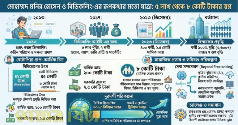 ‘আমাদের কর্মীরা অত্যন্ত নিবেদিতপ্রাণ, দক্ষ ও সৃজনশীল’Ñগর্বের সঙ্গে বলেন মনির। তার দৃঢ় বিশ্বাস, ফ্রিল্যান্সিং দিয়ে শুরু হলেও লক্ষ্য হওয়া উচিত এমন স্থানীয় কোম্পানি গড়ে তোলা যা সরাসরি আন্তর্জাতিক বাজারে কাজ করবে। এতে দেশের ভেতরেই স্থায়ী কর্মসংস্থান তৈরি হবে, মেধাপাচার রোধ হবে। ৫ লাখ টাকা থেকে শুরু করে মাসিক ৮ কোটি টাকা বেতন প্রদানকারী প্রতিষ্ঠানে পরিণত হওয়াÑমোহাম্মদ মনির হোসেনের এই অবিশ্বাস্য যাত্রা প্রমাণ করে, বাংলাদেশের তরুণরা বিশ্বমানের প্রযুক্তি সেবা দিতে সক্ষম। দরকার শুধু সঠিক নেতৃত্ব, দৃঢ় সংকল্প আর স্বপ্ন দেখার সাহস। বিডিকলিং আইটি ও বেটোপিয়া গ্রুপ সেই স্বপ্নের জীবন্ত উদাহরণÑএটাই পজিটিভ বাংলাদেশের প্রেরণাদায়ক অধ্যায়।