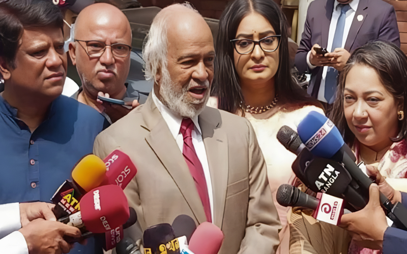 মার্কিন সহকারী পররাষ্ট্রমন্ত্রী পল কাপুরের সঙ্গে বৈঠকের পর সাংবাদিকদের সামনে আসেন বিএনপির স্থায়ী কমিটির সদস্য ড. আব্দুল মঈন খান। ছবি: সংগৃহীত