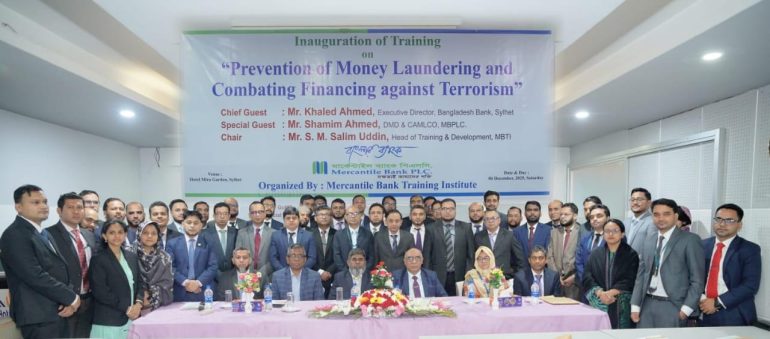 নিজস্ব প্রতিবেদক: সচেতনতা বৃদ্ধি ও কমপ্লায়েন্স শক্তিশালী করার লক্ষ্যে মার্কেন্টাইল ব্যাংক পিএলসি সিলেটে গত শনিবার অর্থপাচার ও সন্ত্রাসে অর্থায়ন প্রতিরোধ বিষয়ক দিনব্যাপী এক প্রশিক্ষণ কর্মশালার আয়োজন করেছে।