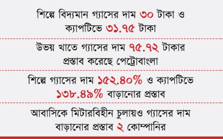 তথ্যমতে, শিল্প ও ক্যাপটিভ খাতে প্রতিশ্রুত গ্রাহকদের (ইতোমধ্যে অনুমোদিত) গ্যাসের বিলও ৭৫.৭২ টাকা নির্ধারণ চায় পেট্রোবাংলা। অন্যদিকে বাখরাবাদ গ্যাস ডিস্ট্রিবিউশন কোম্পানি ও কর্ণফুলী গ্যাস ডিস্ট্রিবিউশন কোম্পানির প্রস্তাবে মিটারবিহীন আবাসিক গ্রাহকদের বিল বাড়ানোর প্রস্তাব করেছে। সব মিটারবিহীন গ্রাহকের আঙিনায় প্রি-পেইড মিটার স্থাপনের পূর্ব পর্যন্ত এক চুলা ৭৩ দশমিক ৪১ ঘনমিটার ও দুই চুলা ৭৭ দশমিক ৪১ ঘনমিটার বিলের কথা বলা হয়েছে। ২০২২ সালের মে মাসে তা নির্ধারণ করা হয় যথাক্রমে ৫৫ ও ৬০ ঘনমিটার।