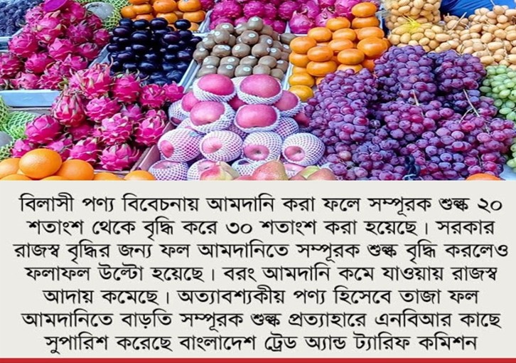 চিঠিতে কমিশন বলেছে, ফলের চাহিদার বড় অংশ পূরণ হয় আমদানির মাধ্যমে। কিন্তু গত কয়েক বছর ডলারের দাম ও শুল্ককর বাড়ার কারণে ফলের দাম বেড়েছে। শুল্ককর কাঠামো এবং ২০২১-২২ ও ২০২৩-২৪ অর্থবছরের আমদানির চিত্র পর্যালোচনা করে দেখা গেছে, ফল আমদানি উল্লেখযোগ্য হারে কমেছে। যেমনÑআপেল আমদানি কমেছে প্রায় ৫২ শতাংশ। এছাড়া মাল্টা আমদানি ৭১ ও আঙ্গুর আমদানি ২৯ শতাংশ কমেছে। তবে গত ৯ জানুয়ারি ফলকে বিলাসী পণ্য বিবেচনা করে এর ওপর সম্পূরক শুল্ক ২০ থেকে বাড়িয়ে ৩০ শতাংশ করার কারণে আমদানি আরও কমেছে। ২০২৪ সালের জানুয়ারির তুলনায় গত জানুয়ারিতে মেন্ডারিন আমদানি কমেছে ৫১ শতাংশ। এছাড়া আঙ্গুর ২১, আপেল ৩, নাশপাতি ৪৬, আনার ও ড্রাগন ফল ৩২ শতাংশ আমদানি কমেছে। কারণ বর্তমানে ৮৬ টাকায় ফল আমদানি করা হলে তার ওপর কর দিতে হয় ১২০ টাকা, যা ভোক্তার জন্য অনেকটা অসহনীয়।
