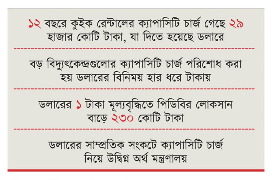 সূত্র জানায়, ২০১০-১১ অর্থবছর থেকে ২০২০-২১ অর্থবছর পর্যন্ত ১১ বছরে শুধু রেন্টাল ও কুইক রেন্টাল বিদ্যুৎকেন্দ্রগুলোর জন্য ক্যাপাসিটি চার্জ গুনতে হয়েছে ২৮ হাজার কোটি টাকা। আর বিদায়ী ২০২১-২২ অর্থবছর এ ব্যয় ছিল আরও প্রায় এক হাজার কোটি টাকা। সব মিলিয়ে ১২ বছরে পিডিবিকে এ খাতে ব্যয় করতে হয়েছে প্রায় ২৯ হাজার কোটি টাকা। আর এ বিলের পুরোটাই গেছে ডলারে। যদিও বর্তমানে কুইক রেন্টালের সংখ্যা কমে এসেছে, তার পরও বিদ্যমান কয়েকটি কেন্দ্রকে ডলারেই ক্যাপাসিটি চার্জ দিতে হচ্ছে।