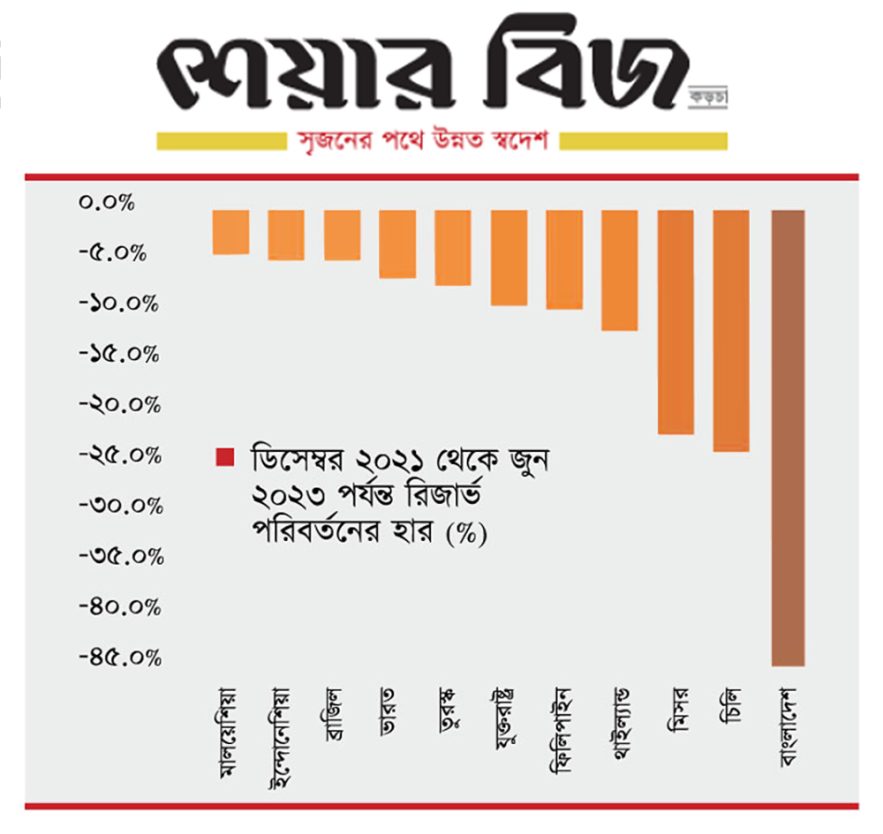 সম্প্রতি মাস্টারকার্ড ইকোনমিক ইনস্টিটিউটের (এমইআই) প্রকাশিত ‘বাংলাদেশ ইকোনমিক আউটলুক’ শীর্ষক প্রতিবেদনে এ তথ্য উঠে এসেছে। এতে দেখা যায়, ২০২১ সালের ডিসেম্বরের তুলনায় ২০২৩ সালের জুন পর্যন্ত বাংলাদেশের রিজার্ভ কমেছে ৪৬ শতাংশের বেশি, যা বিশ্বের বিভিন্ন দেশের মধ্যে সর্বোচ্চ।