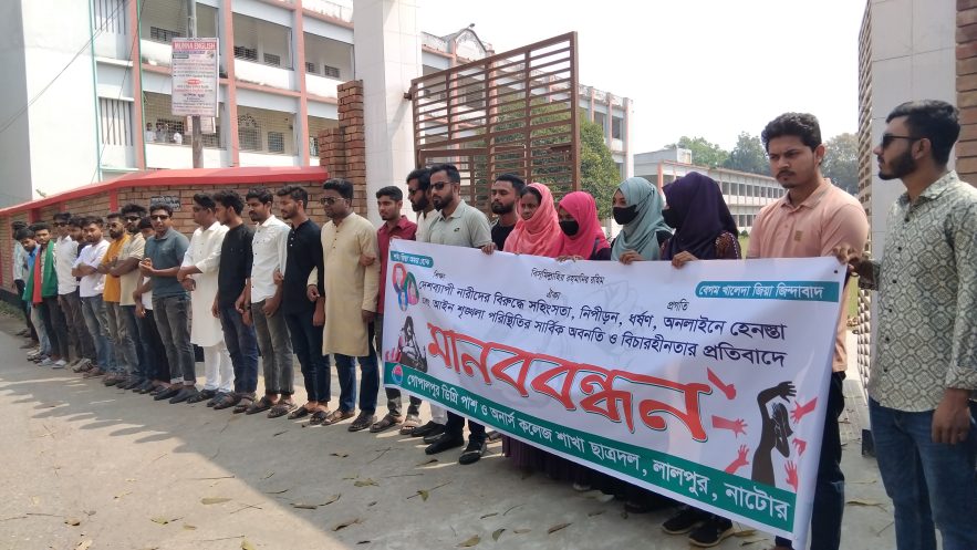 প্রতিনিধি, লালপুর (নাটোর) : দেশব্যাপী নারীদের ওপর সহিংসতা, নিপীড়ন, ধর্ষণ, হেনস্তা এবং আইনশৃঙ্খলা পরিস্থিতির সার্বিক অবনতি ও বিচারহীনতার প্রতিবাদে নাটোরের লালপুর উপজেলার শিক্ষাপ্রতিষ্ঠানগুলোতে মানববন্ধন করেছে ছাত্রদলের নেতাকর্মীরা।