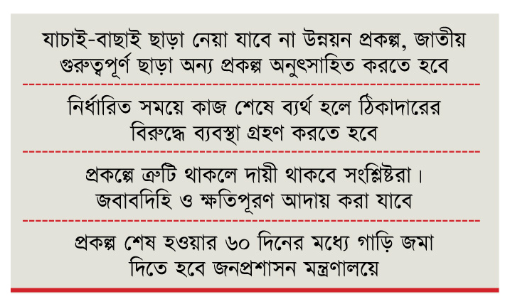 সম্প্রতি এ-সংক্রান্ত চিঠি সরকারের সব মন্ত্রণালয় ও বিভাগে পাঠিয়েছে প্রধানমন্ত্রীর কার্যালয়। ‘নতুন প্রকল্প গ্রহণ ও সুষ্ঠুভাবে বাস্তবায়ন বিষয়ে মাননীয় প্রধানমন্ত্রীর অনুশাসন’ শীর্ষক চিঠিতে সংশ্লিষ্ট নিদের্শনা অনুযায়ী ব্যবস্থা গ্রহণের জন্য সবাইকে অনুরোধ জানানো হয়েছে। পাশাপাশি চিঠির অনুলিপি দেয়া হয়েছে দেশের সব জেলা প্রশাসক ও বিভাগীয় কমিশনারের কার্যালয়েও।