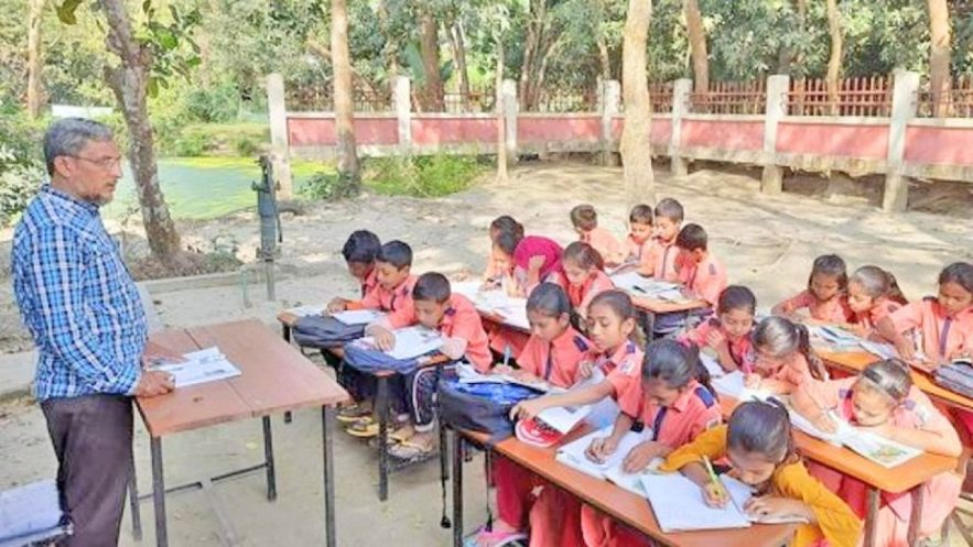 বিদ্যালয়ের প্রধান শিক্ষক জসিম উদ্দিন বলেন, বিদ্যালয়ে দুই শতাধিক শিক্ষার্থী পড়ালেখা করছে। পর্যাপ্ত জায়গার সংকুলান না হওয়ায় পঞ্চম শ্রেণির ২২ শিক্ষার্থীর পাঠদান মাঠেই চলছে।