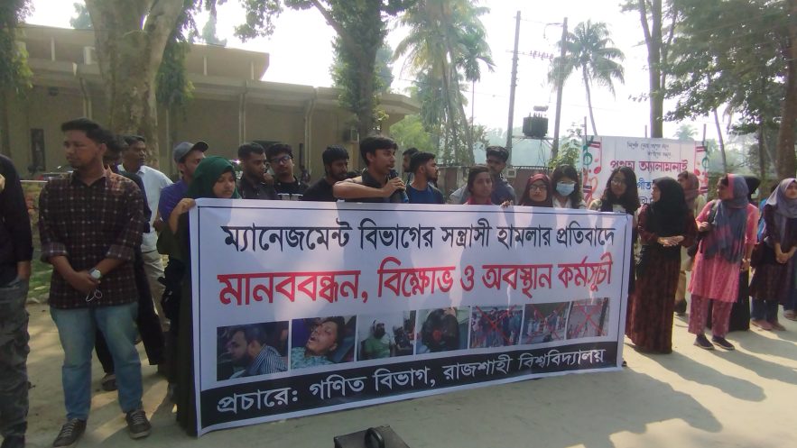 প্রতিনিধি, রাবি: ক্রিকেট খেলায় ম্যানেজমেন্ট বিভাগের শিক্ষার্থীদের সন্ত্রাসী হামলার প্রতিবাদে বিক্ষোভ ও অবস্থান কর্মসূচি করেছে রাজশাহী বিশ্ববিদ্যালয়ের (রাবি) গণিত বিভাগের শিক্ষার্থীরা।