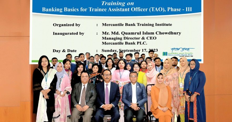 মার্কেন্টাইল ব্যাংকের তৃতীয় ধাপের ট্রেইনি অ্যাসিস্ট্যান্ট অফিসারদের দুই সপ্তাহ মেয়াদি বুনিয়াদি প্রশিক্ষণ সম্প্রতি শুরু হয়েছে। প্রশিক্ষণে ব্যাংকের বিভিন্ন শাখার ৩৮ কর্মকর্তা অংশ নেন। ব্যাংকের ব্যবস্থাপনা পরিচালক মো. কামরুল ইসলাম চৌধুরী কোর্স উদ্বোধন করেন। ব্যাংকের সিএফও তাপস চন্দ্র পাল উদ্বোধনী অনুষ্ঠানে শুভেচ্ছা বক্তব্য প্রদানের পাশাপাশি প্রশিক্ষণে একটি সেশন পরিচালনা করেন। উদ্বোধনী অনুষ্ঠানে মার্কেন্টাইল ব্যাংক ট্রেনিং ইনস্টিটিউটের অধ্যক্ষ জাভেদ তারিক ও অনুষদ সদস্য শাহীন আক্তার উপস্থিত ছিলেন। বিজ্ঞপ্তি