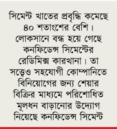 এতে ব্যর্থ হয়ে রেডিমিক্স কারখানা বন্ধ করতে বার্ধ্য হয়। অপরদিকে কনফিডেন্স সিমেন্টের পর্ষদ রাইট শেয়ার ইস্যুর মাধ্যমে কোম্পানির পরিশোধিত মূলধন বাড়ানোর সিদ্ধান্ত নিয়েছে। এক্ষেত্রে বিদ্যমান তিনটি শেয়ারের বিপরীতে একটি রাইট শেয়ার ইস্যু করা হবে। ৩৫ টাকা প্রিমিয়ামসহ প্রতিটি রাইট শেয়ারের ইস্যু মূল্য হবে ৪৫ টাকা। কনফিডেন্স সিমেন্ট ঢাকা লিমিটেড নামে একটি সহযোগী কোম্পানিতে বিনিয়োগের পাশাপাশি মেয়াদি ঋণ পরিশোধের জন্য রাইট শেয়ারের মাধ্যমে মূলধন বাড়ানো হবে বলে জানিয়েছে কোম্পানিটি। এর জন্য বার্ষিক সাধারণ সভার (এজিএম) মাধ্যমে বিনিয়োগকারীদের অনুমোদন নেয়ার পাশাপাশি বাংলাদেশ সিকিউরিটিজ অ্যান্ড এক্সচেঞ্জ কমিশন (বিএসইসি) ও অন্যান্য নিয়ন্ত্রক সংস্থা এবং সংশ্লিষ্ট আইন ও বিধিবিধান পরিপালন সাপেক্ষে রাইট শেয়ার ইস্যু করা হবে বলে জানিয়েছে কোম্পানিটি। বিএসইসির কাছ থেকে অনুমোদন পাওয়ার পর রাইট শেয়ার ইস্যু-সংক্রান্ত রেকর্ড ডেট বিনিয়োগকারীদের জানানো হবে।