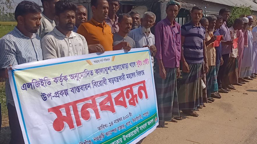 প্রতিনিধি, শেরপুর : শেরপুরের ঝিনাইগাতীতে এলজিইডি কর্তৃক অনুমোদিত কালাঘোশা- মালাঝোড়া খালে সুইচ গেইট উপ-প্রকল্প বাস্তবায়ন বিরোধী ষড়যন্ত্রকারী মহলের বিরুদ্ধে মানববন্ধন অনুষ্ঠিত হয়েছে। আজ সোমবার (১৪ নভেম্বর) সকাল ১১ টায় উপ-প্রকল্প ভুক্ত এলাকার উপকার ভোগী সাধারণ জনগণের উদ্যোগে উপজেলার কাংশা ইউনিয়ন নওকুচি বাজারে এ মানববন্ধনের আয়োজন করা হয়।