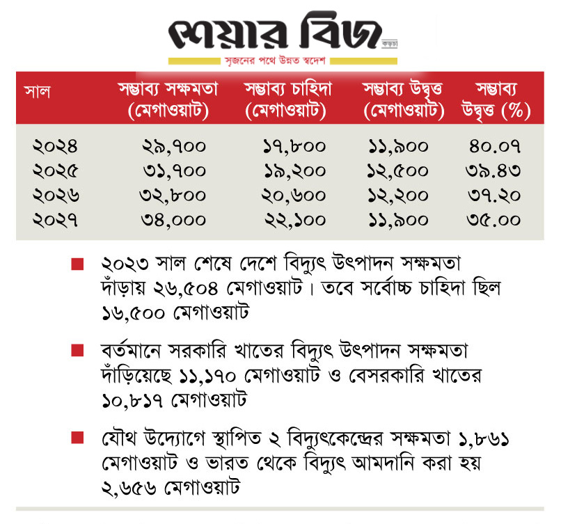 আগামী বছর বিদ্যুৎ উৎপাদন সক্ষমতা বাড়বে দুই হাজার মেগাওয়াট। এতে ২০২৫ সালে দেশে বিদ্যুৎ উৎপাদন সক্ষমতা বেড়ে দাঁড়াবে ৩১ হাজার ৭০০ মেগাওয়াট। কিন্তু সে সময় সর্বোচ্চ চাহিদা বেড়ে দাঁড়াবে ১৯ হাজার ২০০ মেগাওয়াট। এতে ২০২৫ সাল শেষে বসে থাকা বিদ্যুৎকেন্দ্রের সক্ষমতা বেড়ে দাঁড়াবে ১২ হাজার ৫০০ মেগাওয়াট, যা মোট সক্ষমতার ৩৯ দশমিক ৪৩ শতাংশ।